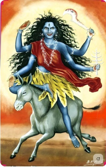 She is depicted with a dark complexion, disheveled hair, three eyes glowing like fire and a necklace that shines with thunderbolts. Seated upon a fearless donkey, she appears terrifying to demons yet deeply protective toward her devotees. In her four hands, she holds a sword and a deadly iron hook while the other two remain in the gestures of giving (varada mudra) and protection (abhaya mudra) – a reminder that her ferocity is only directed at negativity never at her children.