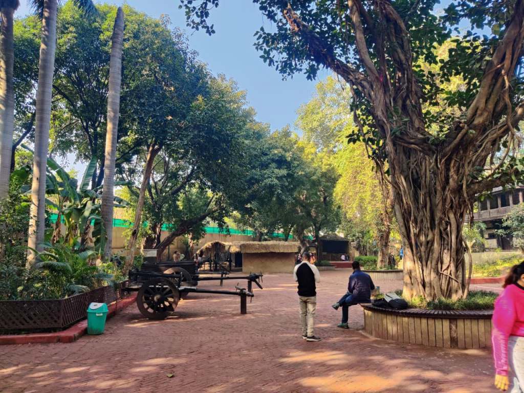It invites you to slow down, to notice the small things – a carved wooden door, a jali screenโs shadow, a mural that feels like itโs telling you an ancient secret. In the courtyard, youโll find replicated village scenes about 15 hand-built structures created by regional craftsmen. There are homes, shrines, terracotta horses and vibrant murals – from Mithila (Bihar) to Santhal tribal art, each representing rural Indiaโs diverse soul.